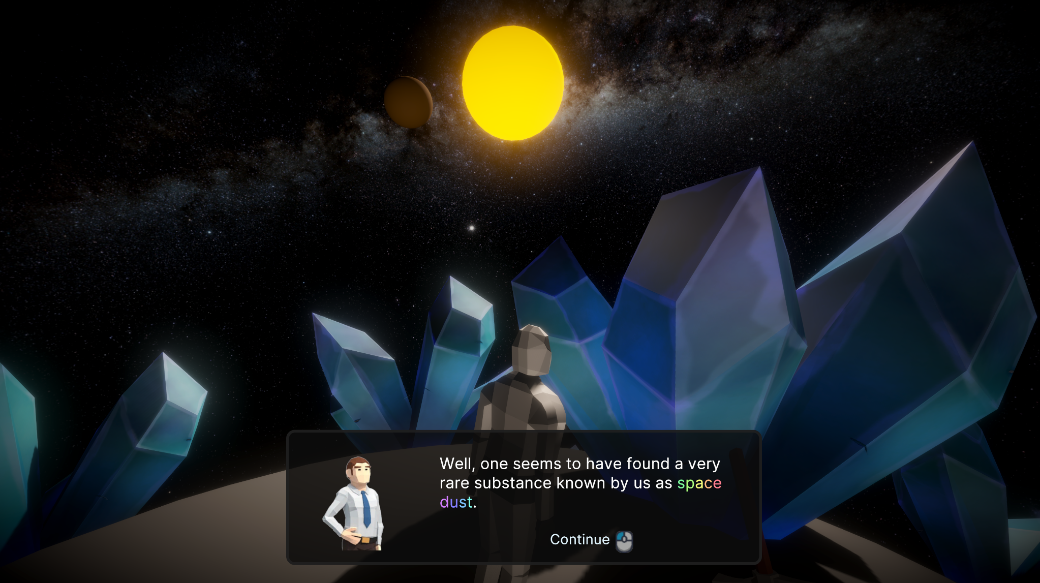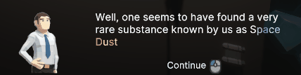 Het ontwerp van het dialog system is simpel en consistent gehouden, met een focus op leesbaarheid en een futuristische uitstraling die past bij het ruimtethema van de game:UI Design: Donkere doorzichtige achtergronden met afgeronde hoeken en contrasterende lichte tekst. Een afbeelding aan de linkerkant, tekst aan de rechterkant en interactieopties rechtsonder. Interactie: Opties vergroten wanneer de muis erover beweegt om interactie intuïtief te maken.