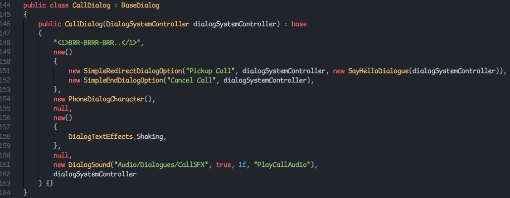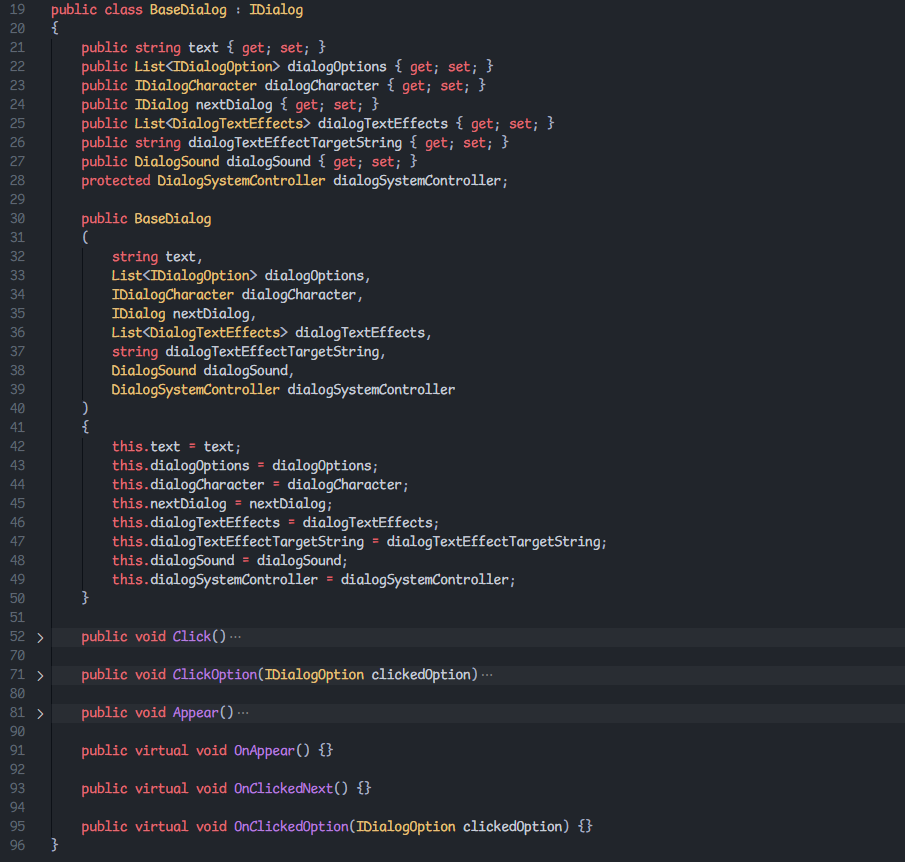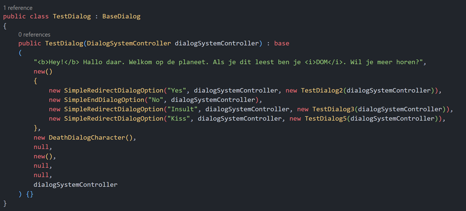 De BaseDialog-klasse vormt de kern van het systeem. Het definieert de basiseigenschappen van een dialoog, zoals de tekst, opties, het karakter dat spreekt, en eventuele tekst- of geluidseffecten.Er zijn een aantal classes die afstammen van BaseDialog, zoals SimpleContinuingDialog en SimpleEndingDialog. Deze classes zorgen voor minder arguments in de constructor en verbeteren de developer experience. Je kan ook gewoon de class zelf gebruiken wanneer dat nodig is.
